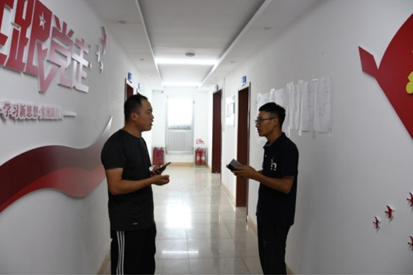 晚餐后趙文頂和孫明慶修理被大雨損壞的門把手。項目部成員共同呵護起項目部溫暖的家。