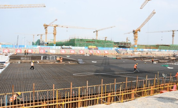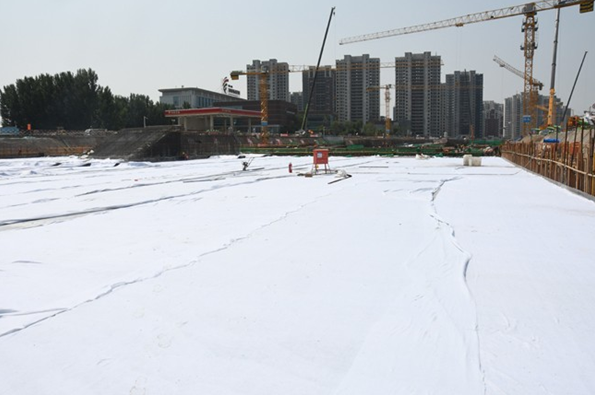 他力薦新工藝應用,對于大體積混凝土的養護工作,初期養護內外溫差大,不宜灑水養護。項目部采用新式水能量膜養護+土工布保溫的方式,同時布置測溫點實時監控砼內外溫度,使養護工作得以量化,用數據說話,及時分析砼內外偏差原因,適度調整,確保主體混凝土質量。(混凝土節水保濕養護膜是以新型可控高分子吸水材料為核心,以塑料薄膜為載體,通過設備加工復合而成的卷材產品。其中高分子材料可吸收自重200倍的水分,吸水膨脹后變成透明的晶體狀,把液態水變成固態水,每平方米養護膜可蓄水0.5KG,成為一個固態的微型水庫,然后通過毛細管的作用向混凝土養護面滲透,同時不斷吸收混凝土在水化熱過程中產生的蒸發水,因此在一個養護期內總能保持混凝土表面濕潤。)